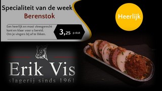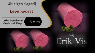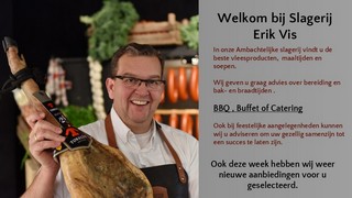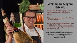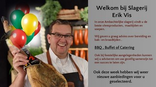 Slagerij Erik Vis is een ambachtelijke slagerij waar het slagersvak nog op klassieke wijze wordt beoefend. Het grootste deel van de worst en vleeswaren die u bij ons koopt, is gemaakt in onze eigen worstmakerij. Wij zijn gevestigd in het centrum van Papendrecht en bieden al sinds 1961 prijswinnende service en producten aan de regio. Op deze website vindt u een overzicht van ons aanbod. Ook kunt u bestellingen plaatsen in onze webshop.