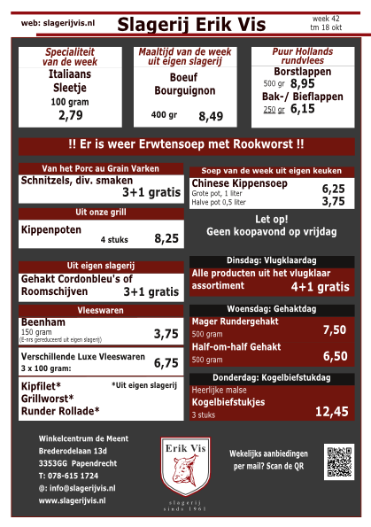 Bij Slagerij Erik Vis profiteert u wekelijks van nieuwe, aantrekkelijke aanbiedingen. Hieronder